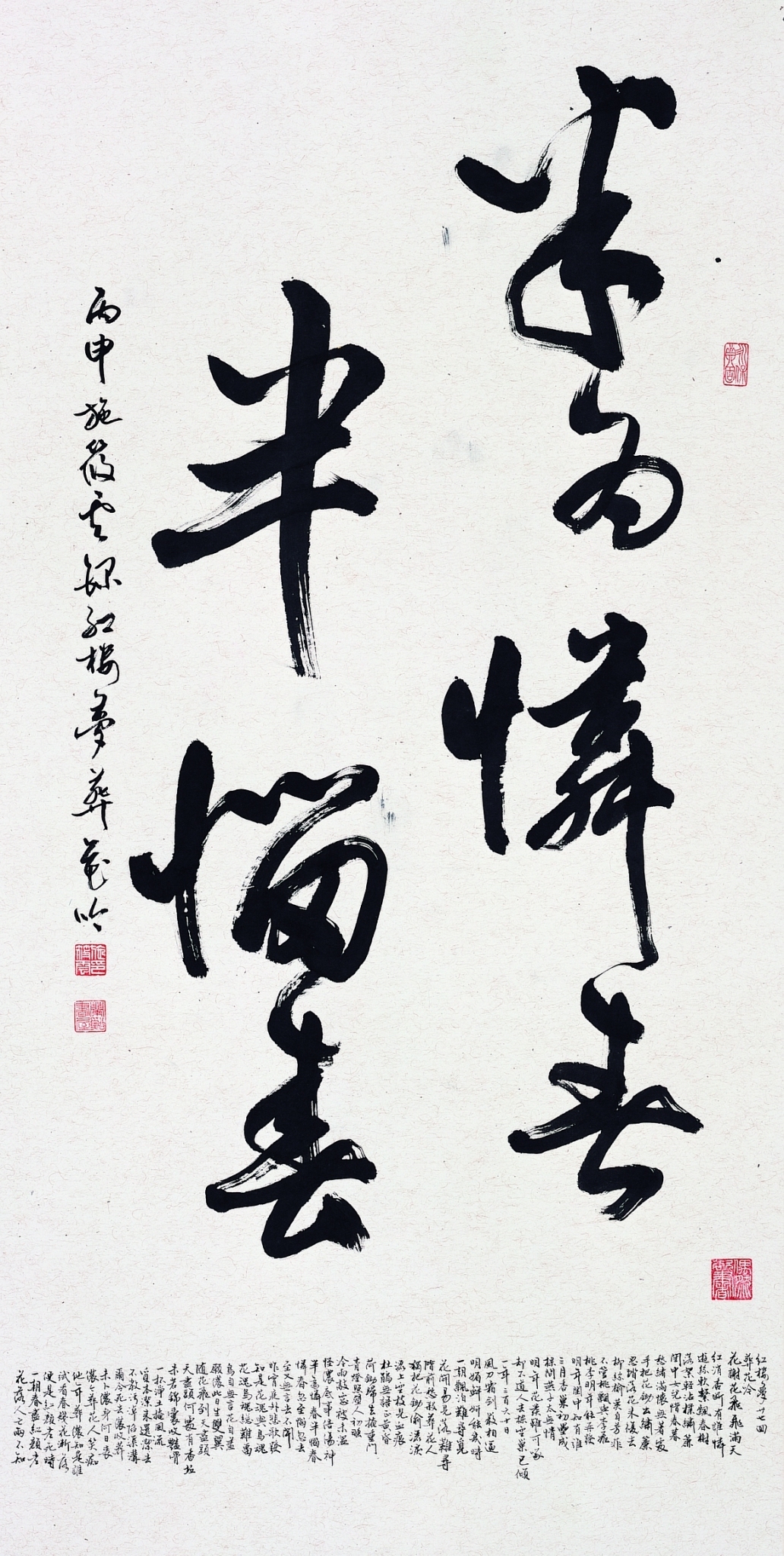 承傳於師門的碑學筆意,點線以渾厚雄健為尚,篆書涵濡心玉盦的婉約流麗,雖所作並不夥,然行筆婉暢、結字勻整,秀雅可觀;隸書取法孔廟三碑,益以姿態的豐富,近年鍾情漢簡的隨興適意,每每強調收筆的波勢,以形成行間的跌宕抑揚,尤以楚簡為構形元素的新作,寫出了篆書系統的異格與奇趣;行書胎息晉唐法度,由於見多識廣又崇尚文人風韻,故寫來細膩溫婉,特別是眾多的落款、跋識中,充分顯露作者為練家的本領;草書厥為女史藝術才調的展顯,碑學、標草的師門根底,逐漸不能囿限其表現草書個性、浪漫的企圖,緣於孫過庭書譜的熟習,晚明書風的參照、近期所作猶如蟬蛻般迥出過往的章法布局形式,頗令人耳目一新,實為長期沉潛、厚積薄發有以致之。(蔡明讚)