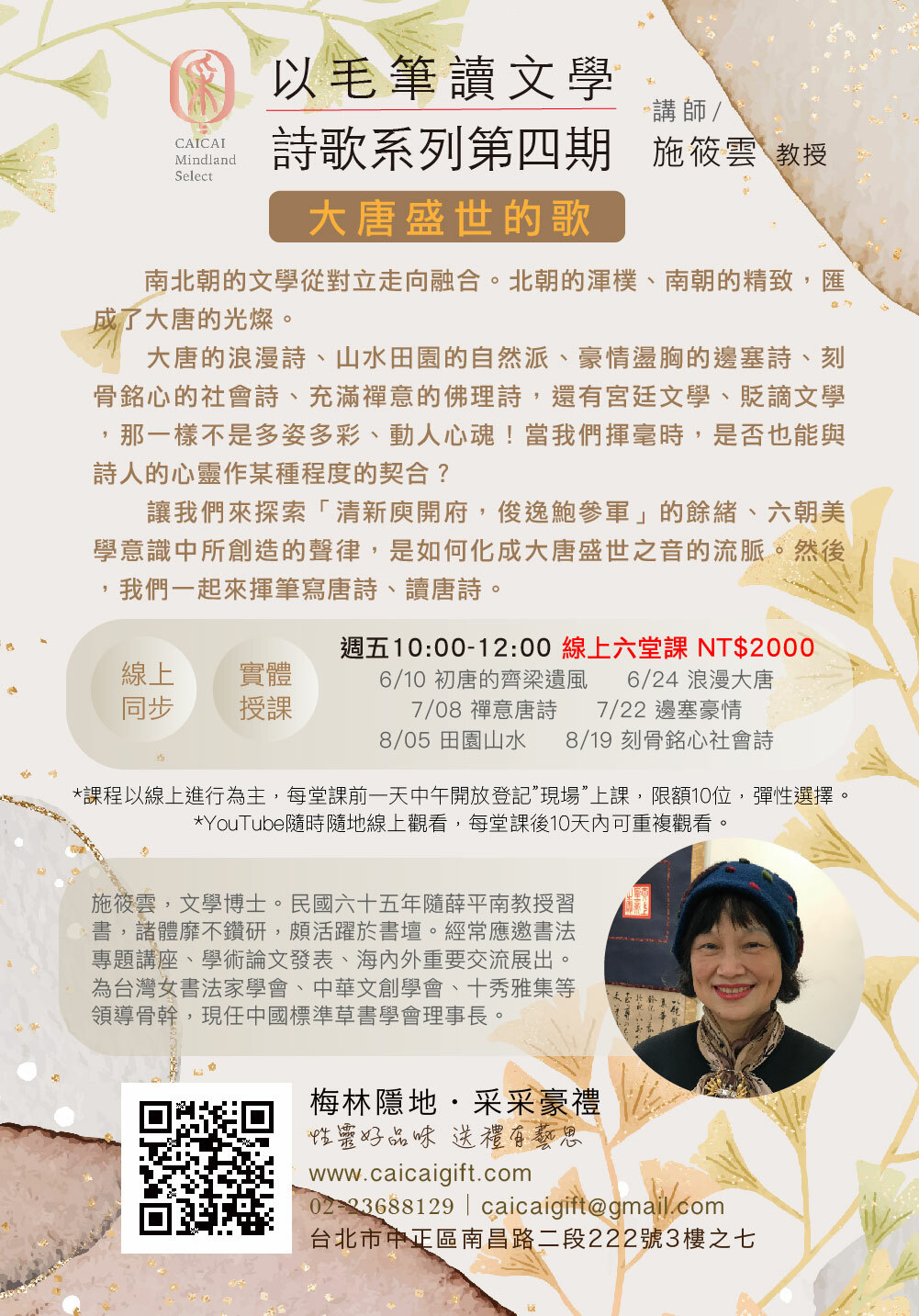 讓我們來探索「清新庾開府,俊逸鮑參軍」的餘緒、六朝美學意識中所創造的聲律,是如何化成大唐盛世之音的流脈。然後,我們一起來揮筆寫唐詩、讀唐詩。