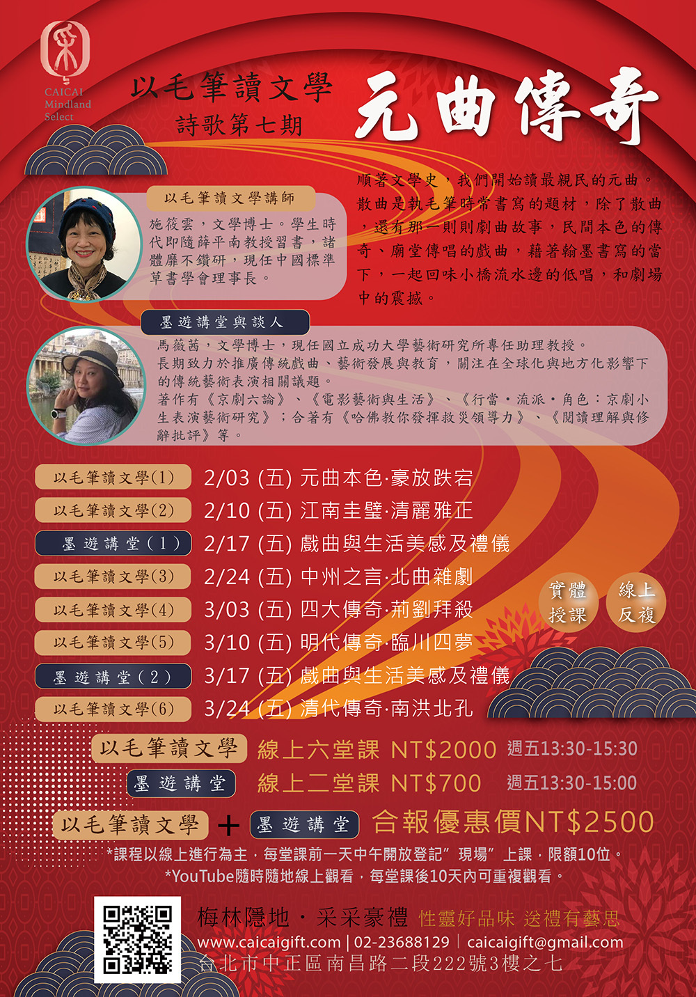散曲是執毛筆時常書寫的題材,除了散曲,還有那一則則劇曲故事,民間本色的傳奇、廟堂傳唱的戲曲,藉著翰墨書寫的當下,一起回味小橋流水邊的低唱,和劇場中的震撼。