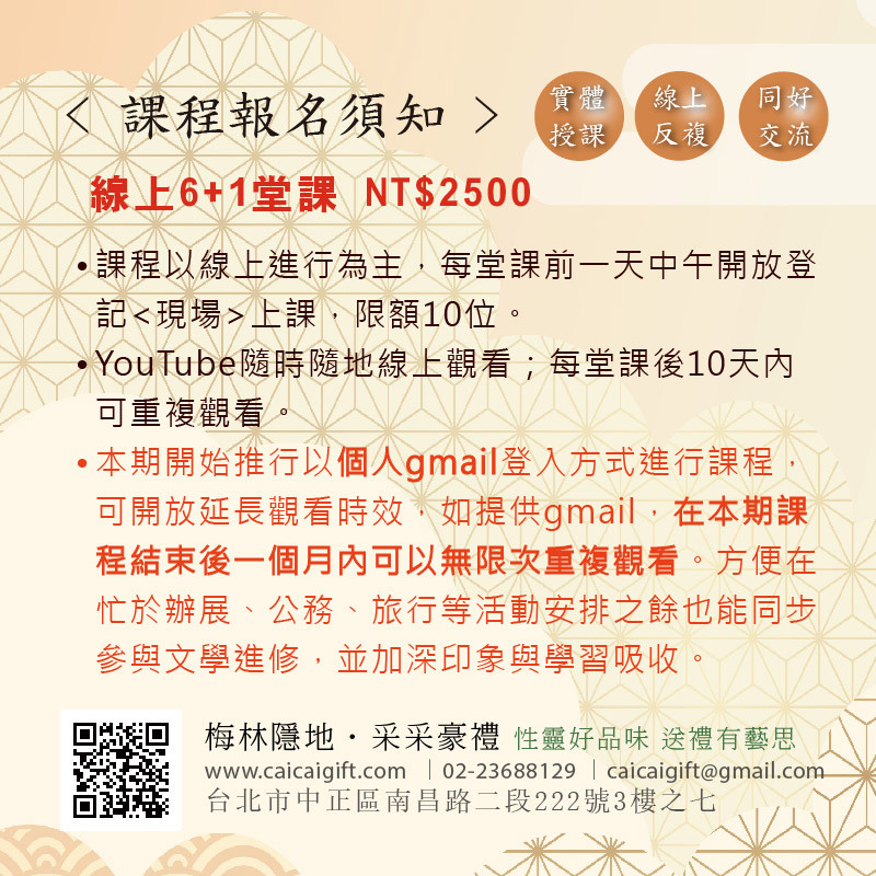 *本期開始推行以個人gmail登入方式進行課程,可開放延長觀看時效,如提供gmail,在本期課程結束後一個月內可以無限次重複觀看。方便在忙於辦展、公務、旅行等活動安排之餘也能同步參與文學進修,並加深印象與學習吸收。