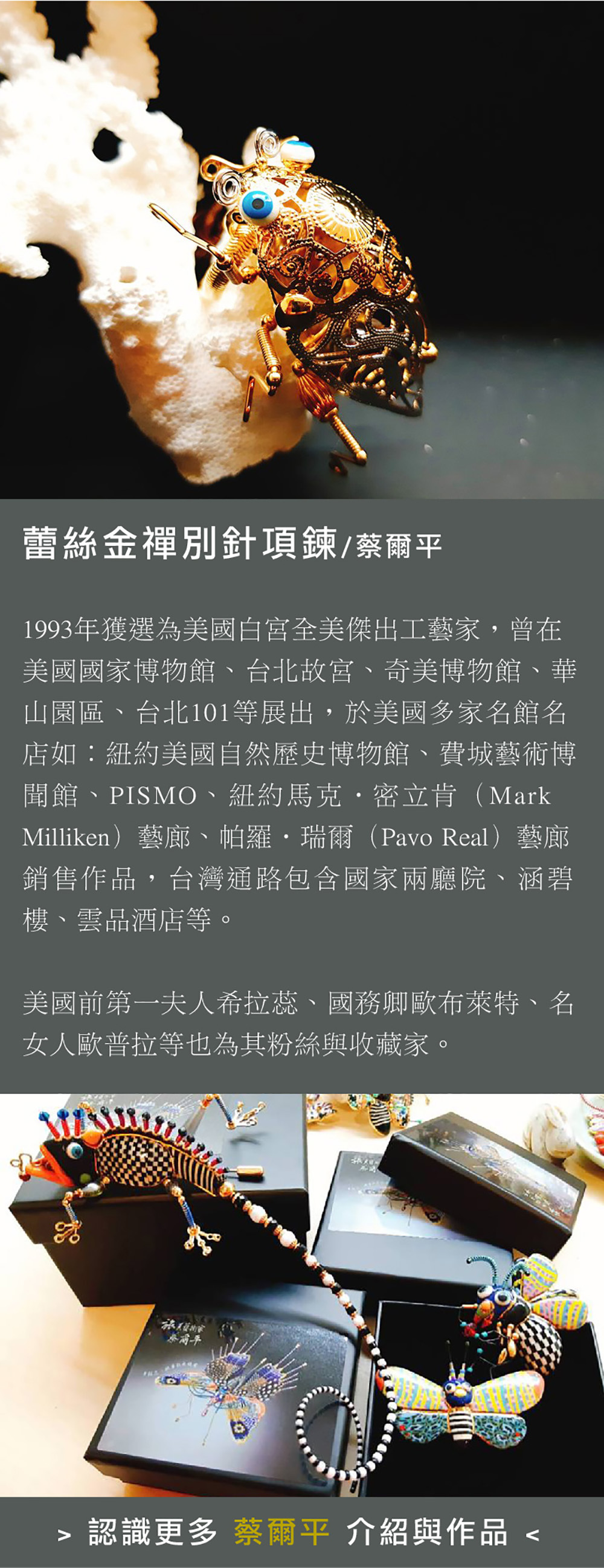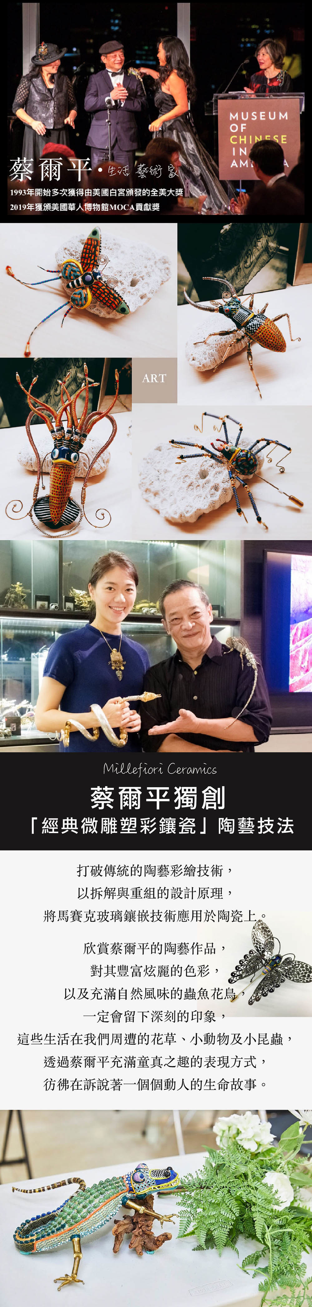 蔡爾平老師,跨足陶藝、金工、繪畫、雕塑、園藝等不同領域,最具識別度的創作符碼【彩鑲瓷】!每件都是獨一無二的藝術創作,絕對不撞款時尚穿戴胸針。亦有大件收藏款,歡迎洽詢客製。