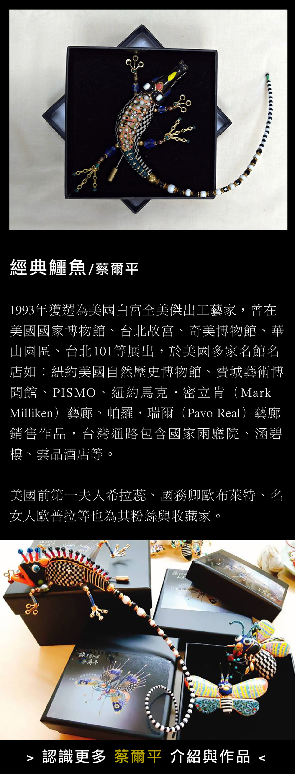 蔡爾平老師,跨足陶藝、金工、繪畫、雕塑、園藝等不同領域,最具識別度的創作符碼【彩鑲瓷】!每件都是獨一無二的藝術創作,絕對不撞款時尚穿戴胸針。亦有大件收藏款,歡迎洽詢客製。