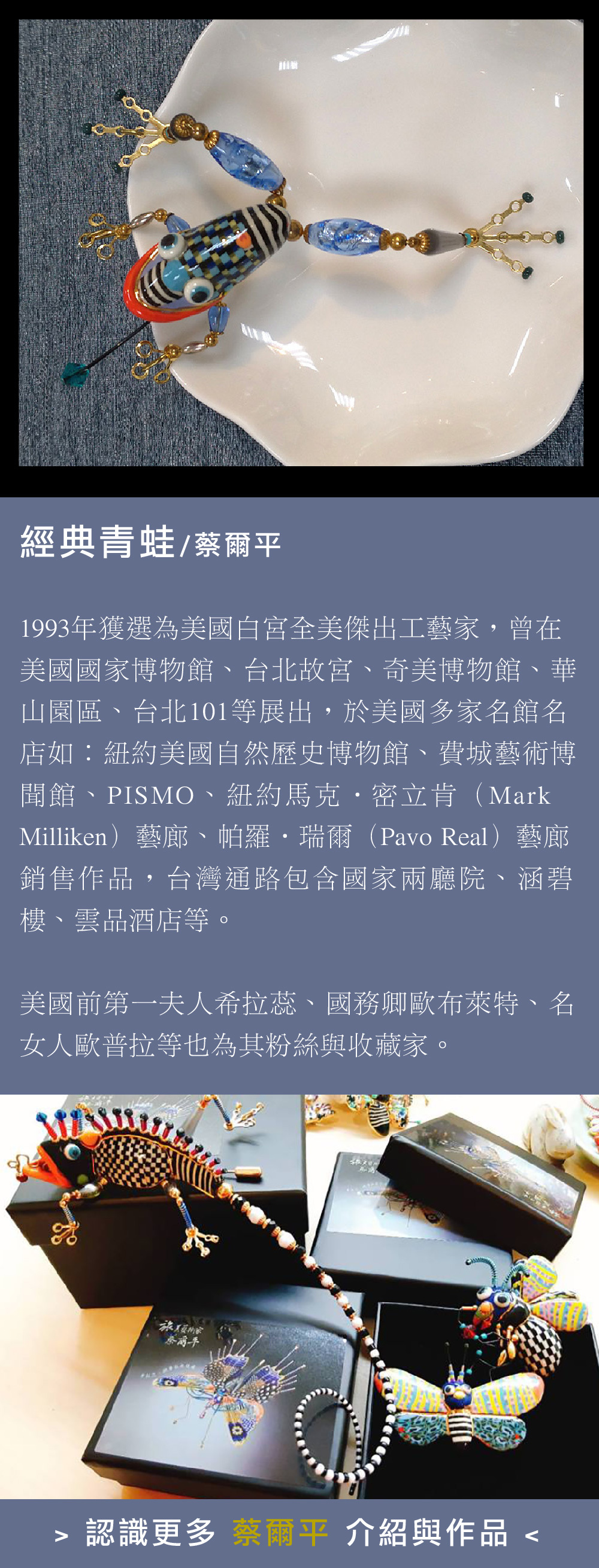 蔡爾平老師,跨足陶藝、金工、繪畫、雕塑、園藝等不同領域,最具識別度的創作符碼【彩鑲瓷】!每件都是獨一無二的藝術創作,絕對不撞款時尚穿戴胸針。亦有大件收藏款,歡迎洽詢客製。