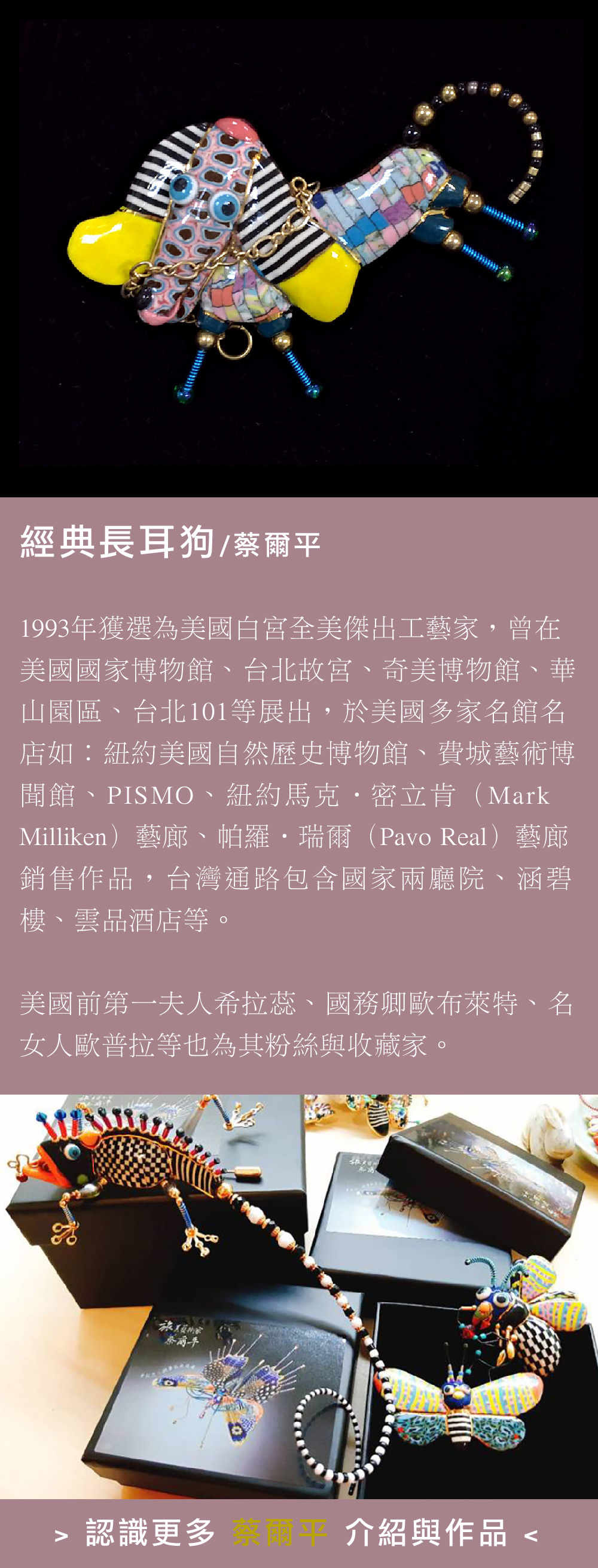 蔡爾平老師,跨足陶藝、金工、繪畫、雕塑、園藝等不同領域,最具識別度的創作符碼【彩鑲瓷】!每件都是獨一無二的藝術創作,絕對不撞款時尚穿戴胸針。亦有大件收藏款,歡迎洽詢客製。