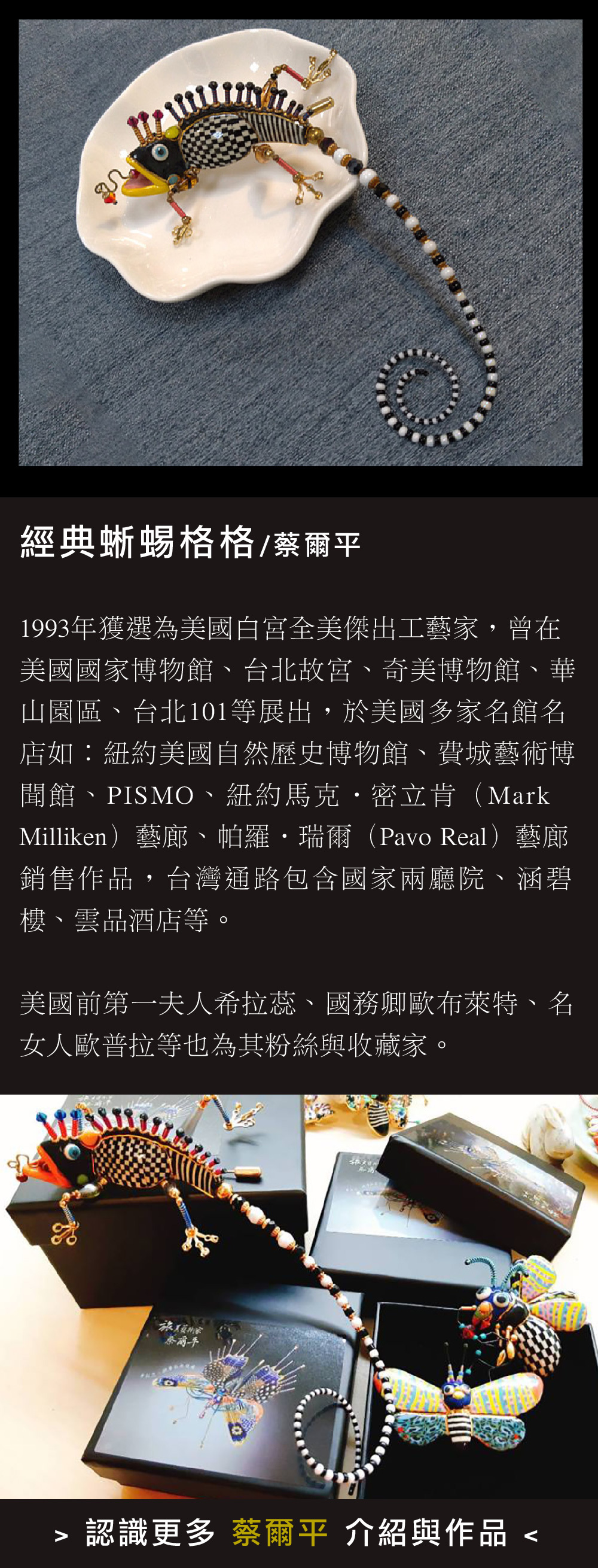 藝術家從自然出發,以生態為主題,用彩鑲瓷微雕出大自然的力與美。鼓勵每個人重新省思生命意涵,透過穿戴飾物表達個人信念。讓飾品不僅是創作者的表現舞台,也能體現配戴者的價值思想。