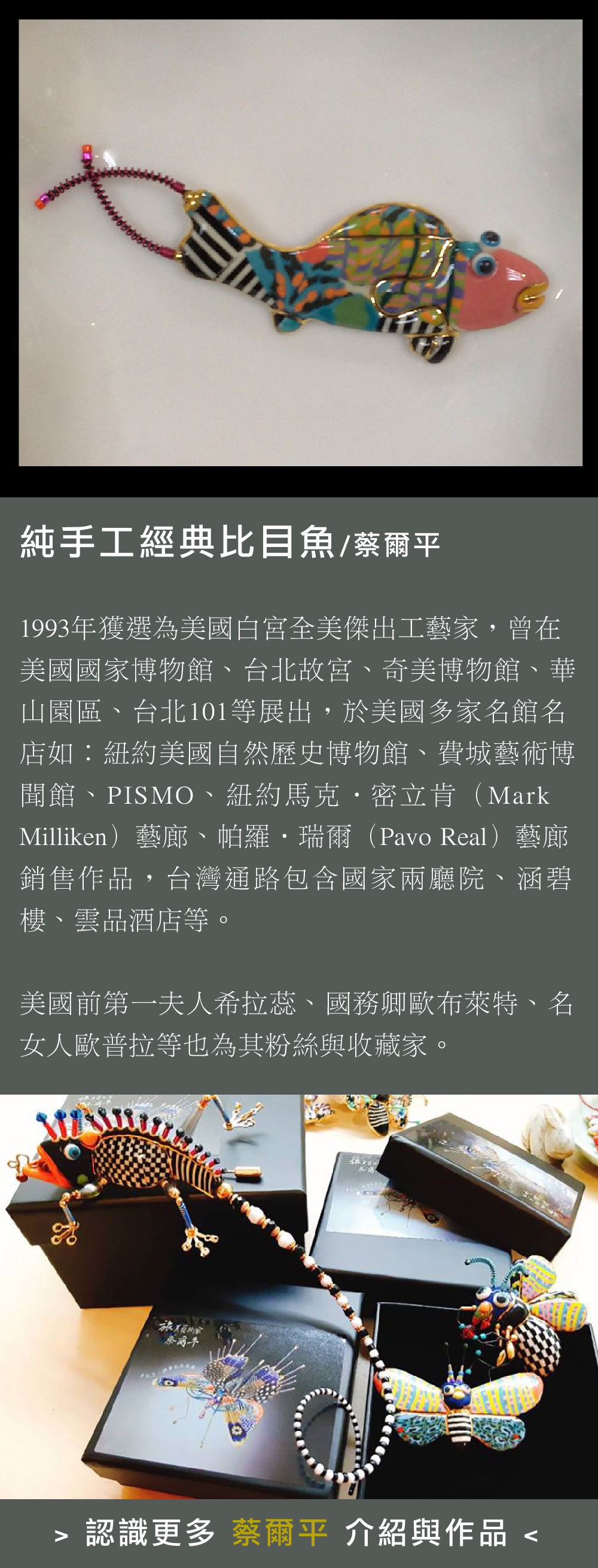 蔡爾平老師,跨足陶藝、金工、繪畫、雕塑、園藝等不同領域,最具識別度的創作符碼【彩鑲瓷】!每件都是獨一無二的藝術創作,絕對不撞款時尚穿戴胸針。亦有大件收藏款,歡迎洽詢客製。